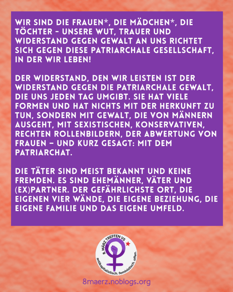 Der Widerstand, den wir leisten ist der Widerstand gegen die patriarchale Gewalt, die uns jeden Tag umgibt. Sie hat viele Formen und hat nichts mit der Herkunft zu tun, sondern mit Gewalt, die von Männern ausgeht, mit sexistischer, konservativen, rechten Rollenbildern, der Abwertung von Frauen – und kurz gesagt: mit dem Patriarchat.