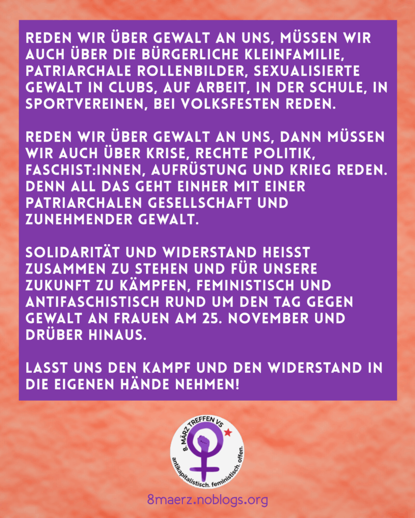 Solidarität und Widerstand heißt zusammen zu stehen und für unsere Zukunft zu kämpfen, feministisch und antifaschistisch rund um den Tag gegen Gewalt an Frauen am 25. November und drüber hinaus.